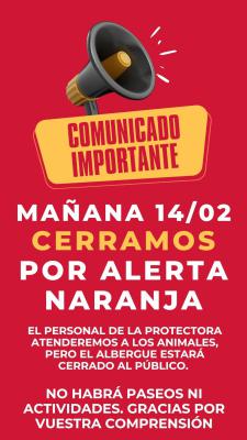 HoyMañana 14 de febrero las puertas del albergue permanecerán cerradas al público debido al estado de alerta naranja en el que nos encontramos.